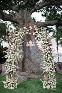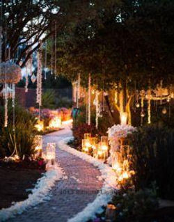 В оформление выездной церемонии особую красоту создадут мерцающие свечи, и чем больше их - тем красивее. Огромные уличные фонари, высокие подсвечники и колонны с цветочными композициями, деревья, обвитые фонариками, рисунки из лепестков роз, и, конечно же, переливчатые блики роскошных антикварных люстр – всё это отлично впишется в общую концепцию